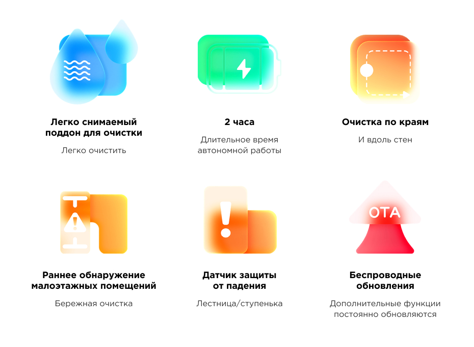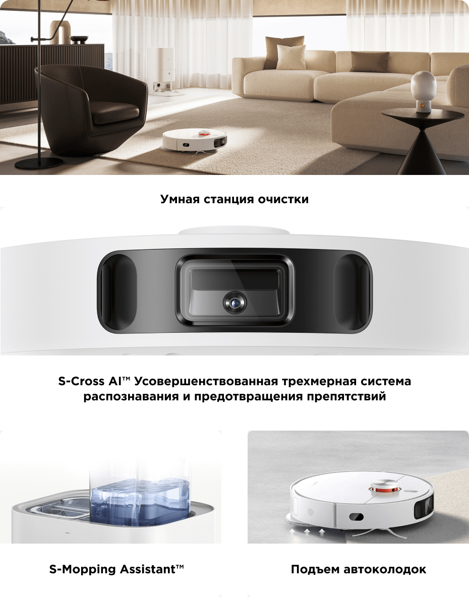| Другие функции и возможности | автоматический забор мусора, заполнение контейнера водой, зарядная станция, полоскание мопов, автоматическое возвращение на зарядную станцию, голосовое управление через ассистентов |