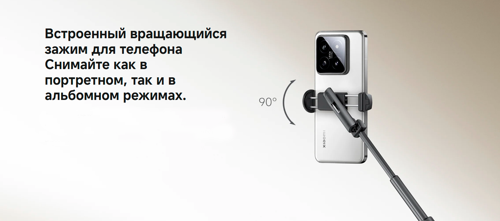 Держатель смартфона поворачивается на 90°, позволяя снимать как в горизонтальном, так и в вертикальном формате. Противоскользящие накладки обеспечивают надежную фиксацию устройства и устойчивость при использовании.