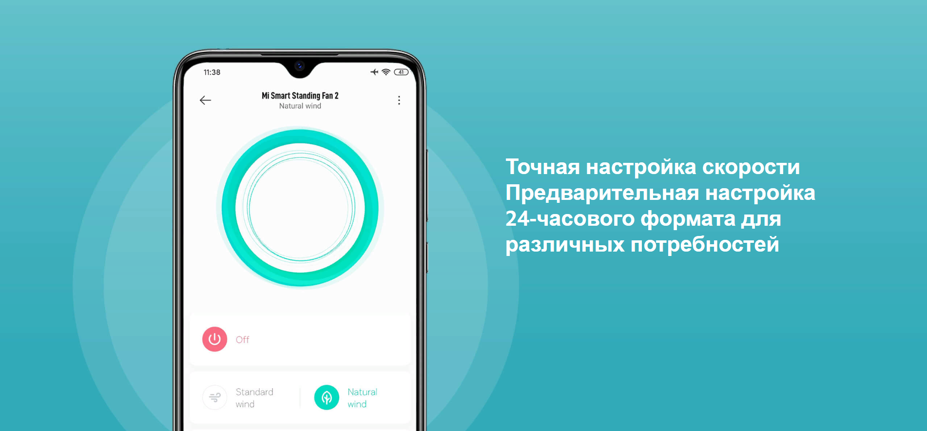 Переключение между режимами «Природный ветер» и «Прямой обдув». Установите скорость вентилятора в диапазоне от 1 до 100 в приложении Mi Home для обеспечения необходимого воздушного потока.