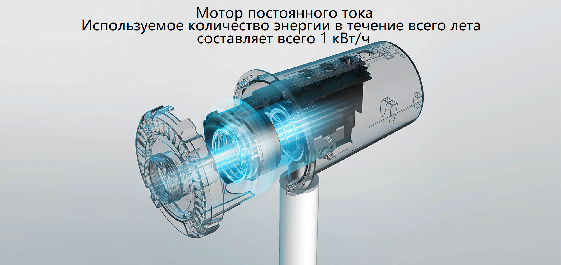 В вентиляторе используется мотор постоянного тока с медной обмоткой, который отличается более высокой эффективностью работы и более длительным сроком службы, чем мотор с алюминиевой обмоткой. Он обеспечивает постоянную скорость для более стабильной вентиляции и снижения энергопотребления. Лопасти в форме крыльев обеспечивают максимальную скорость воздушного потока 20 м³/мин.