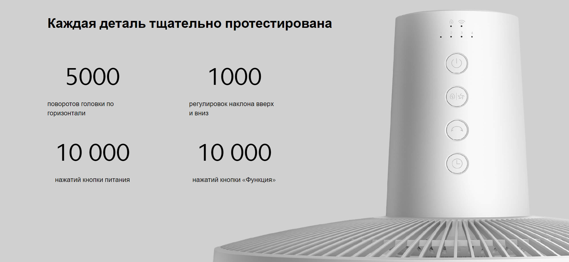 Вентилятор прошел тщательное тестирование на надежность. Вентилятор выдерживает: 5000 поворотов головки по горизонтали, 1000 регулировок наклона вверх и вниз, 10 000 нажатий кнопки питания, 10 000 нажатий кнопки «Функция».