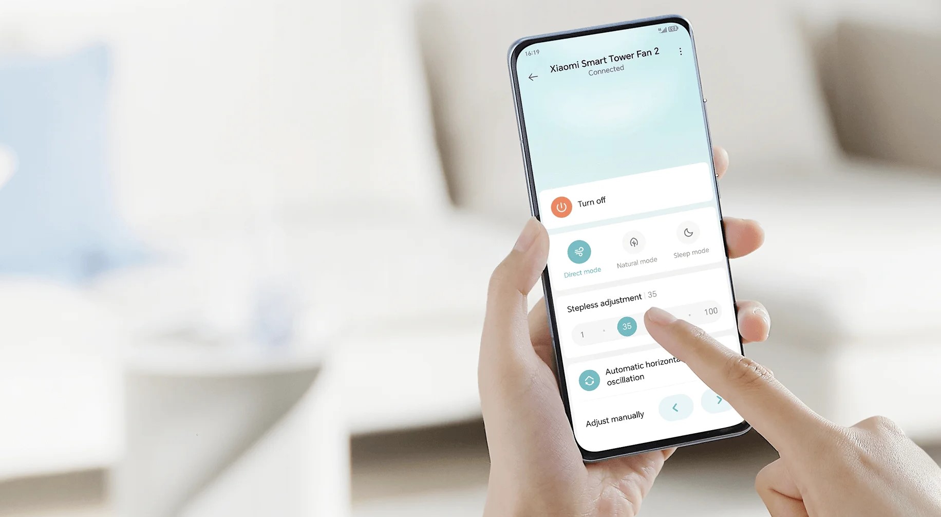Турбина плавно вращается, обеспечивая стабильный воздушный поток с высокой производительностью до 494 м³/ч, быстро сгоняя теплый воздух для мгновенного охлаждения. Можно использовать приложение Xiaomi Home или само устройство для переключения между естественным режимом, прямым режимом и режимом сна. Благодаря множествам регулируемым уровням скорости вентилятор удовлетворит любые потребности.